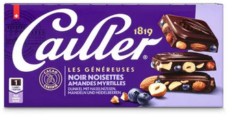 NEU - 200g-Tafel von Cailler - Dunkle Schokolade - Noir - Haselnüsse, Mandeln und Heidelbeeren. Knackige Haselnüsse, Mandeln, verbunden mit köstlicher dunkler Schokolade aus hochwertigem Kakao und Heidelbeeren, für ein intensives Geschmackserlebnis. Alleine oder mit Freunden geniessen - für intensive gemeinsame Momente voller Emotionen.